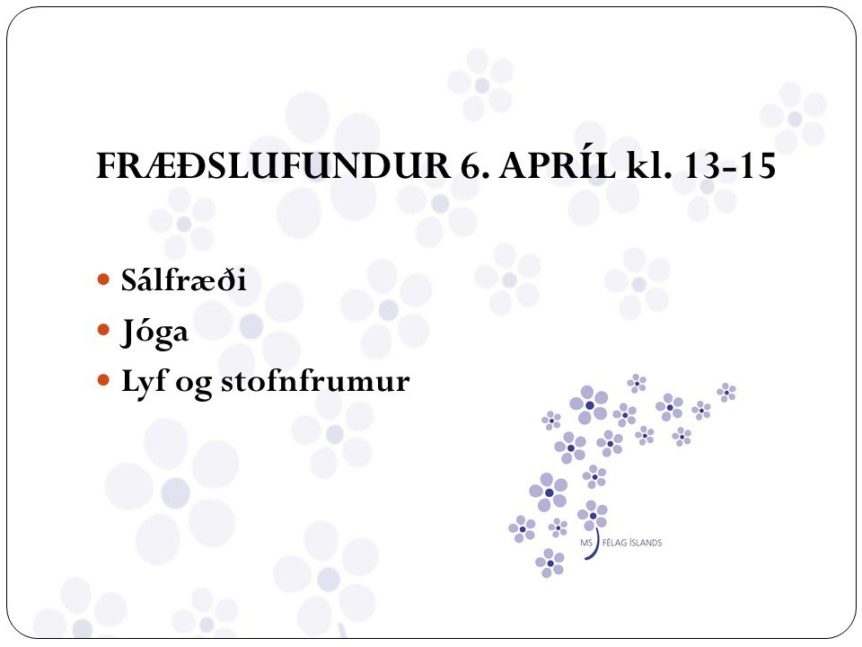 Fræðsluteymi MS-félagsins stendur fyrir fræðslufundi með fróðlegum fyrirlestrum um sálfræði, jóga og meðferðir við MS í húsnæði félagsins að Sléttuvegi 5 laugardaginn 6. apríl kl. 13-15.