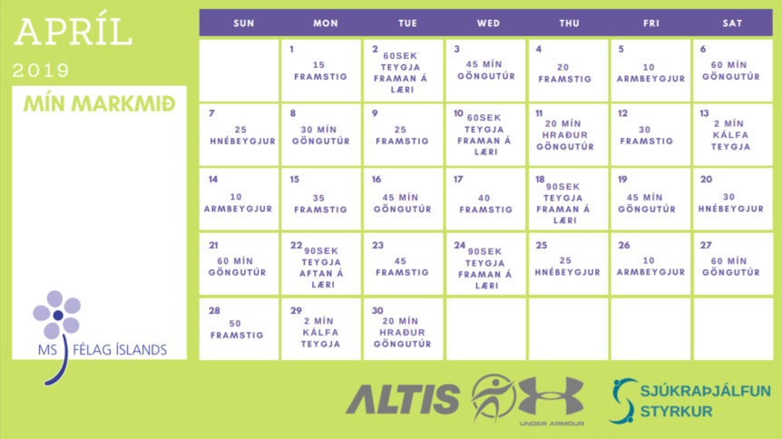 Sigurður Sölvi Svavarsson, sjúkraþjálfari hjá Styrk, hefur sett upp dagatal með fjölbreyttum æfingum fyrir hvern dag mánaðarins.